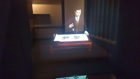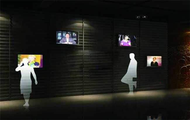 觀眾看到墻面上多個(gè)顯示設(shè)備中,每個(gè)顯示畫面中都有人物的視頻靜止影像。每臺(tái)電視下都有一個(gè)控制按鈕(可以是自動(dòng)感應(yīng)器),當(dāng)觀眾按到其中一個(gè)時(shí)(當(dāng)自動(dòng)感應(yīng)器撲捉有人接近 ……